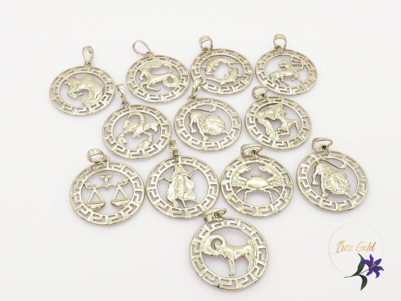 Gold Filled 12 csillagjegy medál szélét körbe görögmotívum díszíti Szin: rodium Méret: 32x25mm A forgalmazott divatékszerek alapanyaga nikkel és ólommentes ezért többnyire nem okoznak allergiás tüneteket, nyugodtan hordhatják fémérzékeny emberek is. Általában nem színezik a bőrt és más divatékszerekhez képest nagyságrendekkel jobb kopásállósággal rendelkeznek. A f
