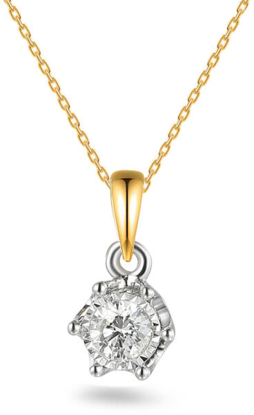Elegáns medál kombinált fehér és sárga aranyból, briliáns kerek gyémánttal díszítve 0,18 ct. A gyémánt hat finom fehérarany cseppben van rögzítve, amelyek lehetővé teszik, hogy kitűnjön és a lehető legjobban tükrözze a fényt. A felakasztásra szolgáló fűzőlyuk sárga aranyból készült. Ez az ékszer fényűzőnek és időtlennek tűnik, ideális mindennapi viselethe