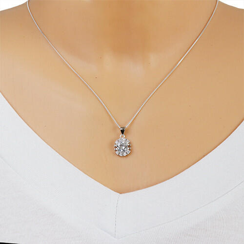 A 925 ezüst medál felülete ródiummal kezelt és egy kerek csillogó átlátszó cirkónia alkotja, amelyet cirkóniákkal és kivágásokkal díszített szegély határol. A fényes láncra kerülő szem a medál tetején helyezkedik el és enyhén szélesedik. A medál mérete: 11 x 15 mmA láncra kerülő szem szélessége: 3 mmA medál súlya: 2,1 gFémjelzéssel ellátva. Medál lánc nél