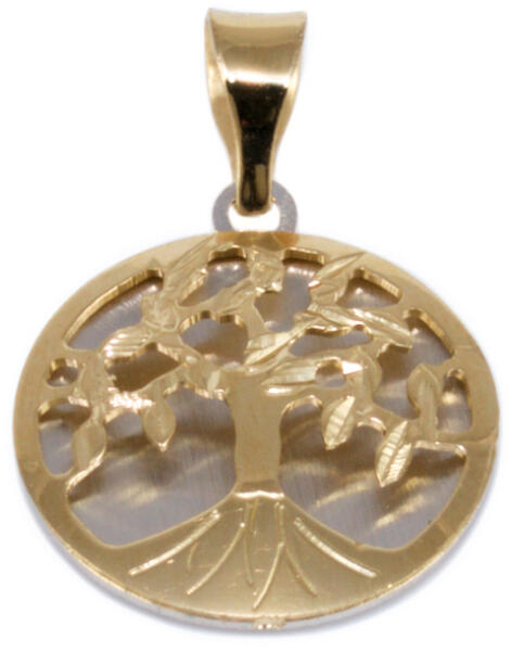 Modern stílusú, ródiummal és mattítással díszített kör alapon áttört életfa motívumos rátéttel kombinált, vésett arany medál.