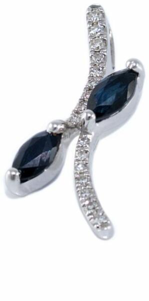 Különleges és elegáns, csónak alakú zafír kövekkel és gyémántokkal ékített, ródiummal bevont arany medál.