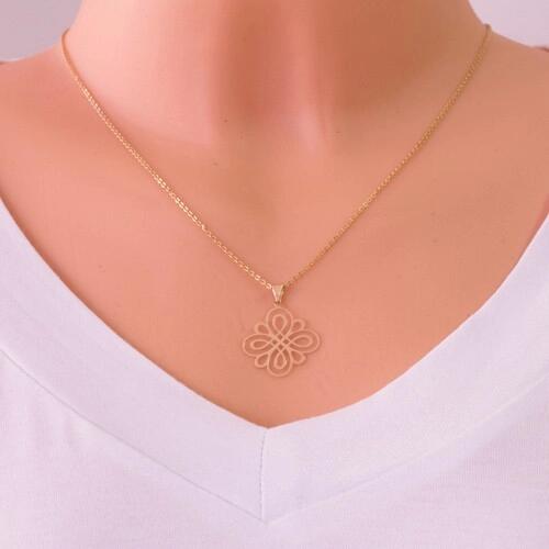 A 14K sárga arany medál fényes és lapos ornamentum alakú, amely összefonódott hurkokból áll. A láncra kerülő szem hosszúkás, felfelé enyhén szélesedik. Medál méretei: 22 x 22 mmMedál súlya: 0,52 gLáncra kerülő szem szélessége: 2 mmFémjelzéssel ellátott. Medál lánc nélkül.