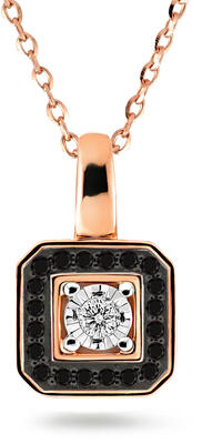 Az ékszerbe 0,0800 ct összsúlyú gyémántokat helyeztek, amelyek közül kiemelkednek a fekete gyémántok, amelyek egyedi és modern jelleget kölcsönöznek az ékszernek. Egy klasszikus, G színű és SI1 tisztaságú fehér gyémánt szikrázó ragyogásával kiegészíti az egész dizájnt. A gyémántok kerek csiszolásúak, kiváló szimmetriával és kivitelezéssel. Ez a medál töké