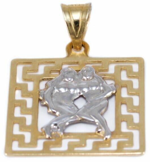 Modern stílusú, kedvelt fazonú, ródiummal díszített, áttört, "meander" mintás "Ikrek" horoszkópos, kétszínű arany medál.