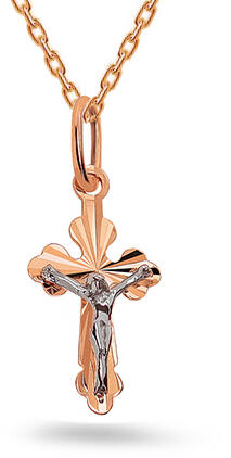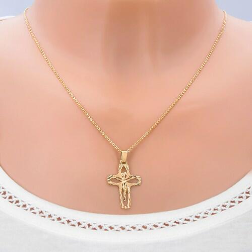 Medál 14 karátos sárga aranyból keresztkörvonal alakban. Mindegyik szára közepén egy kivágás található hosszított szem alakban. A felszíne vékony hajlításokkal díszített, melyek a középről kisugárzó sugarakra emlékeztetnek. A kereszt közepén háromdimenziós Krisztus alak található pergamen táblával melyen INRI felirat található. A láncon lévő szem ovális alak