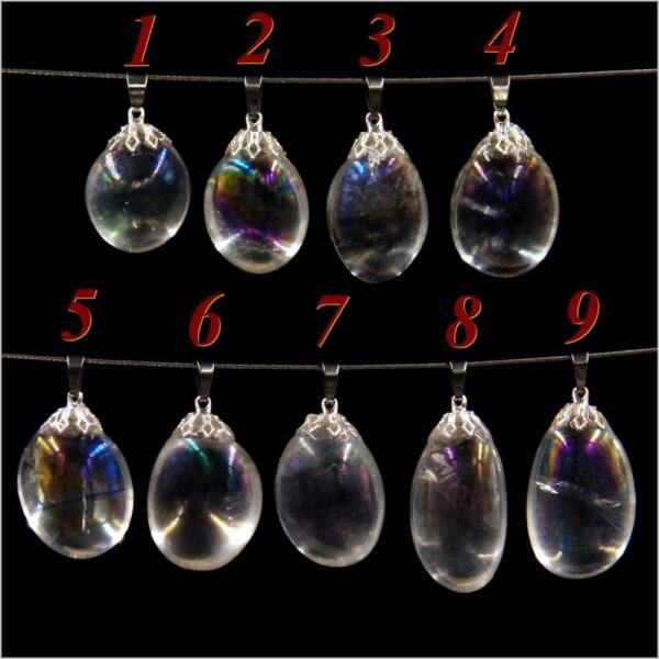 Angyal aura, vagy opál aura kvarc néven is ismert különleges kristály medál. Mérete: kb. :2-3cm, a kép száma szerint választható a medál. Szinte zárványmentes, teljesen áttetsző dob-csiszolt hegyikristályokat alkímiai folyamatokkal, mesterségesen platinával vonták be, -e miatt sokkal világosabb benne a szivárványszín. Miként az égen feltűnő szivárvány reményt és op