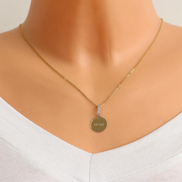 9K kombinált aranyból készült medál egy tükör simára csiszolt, lapos, sárga arany körrel van kialakítva, amelynek közepén egy vésett "MOM" felirat ( Anya) található. A medál csat egy lekerekített fehér arany vonallal van kialakítva, amely a hátulján elhelyezkedő kis gyűrűhöz csavarodik. A vonalat tiszta színű beágyazott kerek cirkóniák díszítik. Medál átmérője: