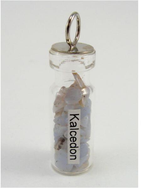 Ezoterikus üveg medál, valódi ásványkövekkel. Használható medálnak, vagy talizmánnak. 3x1cm-es üvegben, kalcedon ásványok 7mm-es karika bújtatóval teljes magasság: 4cm VIGYÁZAT! TÖRÉKENY! A kalcedon gyógyhatása