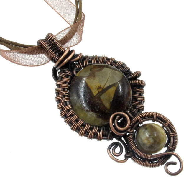 Szeptária ásványokat foglaltam vörös réz huzalba. A medál mindkét oldala viselhető, más-más mintával. A réz 100% tisztaságú, antikolt, polírozott, speciális védőréteggel ellátott így a szinét, fényét megtartja. A medálhoz egy barna organza nyaklánc tartozik. Bövebb információ "ADATOK PARAMÉTEREK" fül alatt. A szeptária hatása