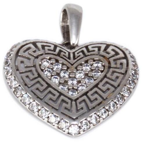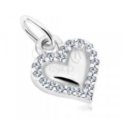 925 ezüst medál, szív alakzat. A szív széle átlátszó, kerek cirkóniákkal díszített. A szív közepe enyhén kiemelkedik, sima, fényes felületű. A láncra kerülő szem ovális. Medál méretei: 8 x 10 mmLáncra kerülő szem szélessége: 1,5 mmSúly: 0,5 gFémjelzéssel ellátott. Medál lánc nélkül.