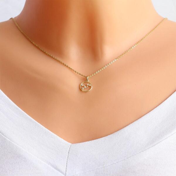 Kör alakú medál sárga 9K aranyból. A körön belül a "Szűz" csillagkép található. A csillagkép keskeny arany színű részekből áll, amelyeket apró tartókba foglalt kis átlátszó cirkóniák egészítenek ki. A cirkóniák közötti teret két arany színű gömb díszíti, egy csillagkép részeként. A medál felülete sima és erősen fényes. A lánc szeme ovális alakú. Med