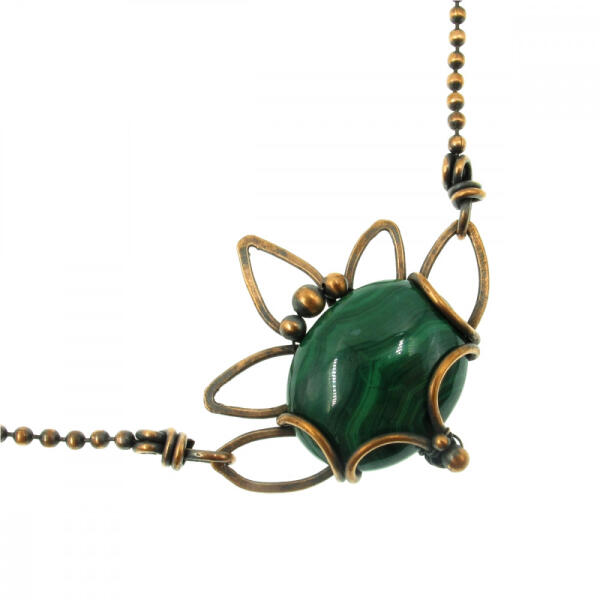 Egyedi malachit köves lótusz nyaklánc, antikolt 100%-os vörösréz huzalba foglaltam. A Malachit ovális csiszolású, alja lapos, nincs furata, nincs ragasztás, kizárólag a rézhuzal foglalat rögzíti! A malachit valódi, nem utánzat! A malachit vélt hatása A réz vélt hatása Figyelem, a Malachit porózus drágakő!!! Ami annyit jelent, hogy vízben oldódik, vízzel nem tisztíthat
