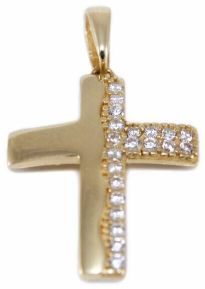 Fényes arany kereszt medál, egyik felén cirkónia kövekkel díszítve.