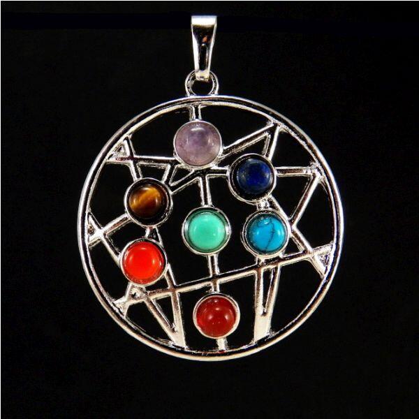 " KAPCSOLAT " csakra medál, féldrágakő ásványokkal . (ametiszt, lápisz, kalcedon, türkinit, tigrisszem, korall, karneol). Medál mérete: 35mm