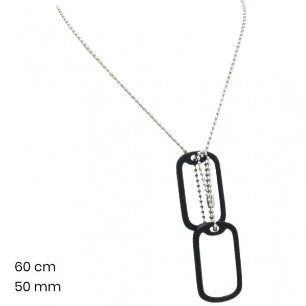 A rozsdamentes acél ékszereink allergiamentesek. Termék jellemzői: 2 darab rozsdamentes acél 1,6 mm vastag, strapabíró anyagú dögcédula, fekete színű gumis védőkerettel és egy 37cm hosszú lánccal. Mindkét medál, mindkét oldala gravírozható, körvonalasan. A gravírozás színe fém színű lesz. K artondobozba csomagolva szállítjuk. Gravírozási technika : Mechanikus (kör