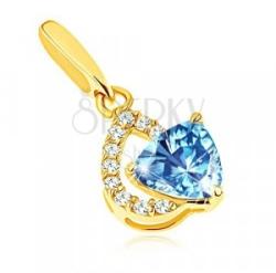 Medál 14K sárga aranyból átlátszó cirkóniás cseppkörvonalból, melyen kék háromszög alakú topáz van foglalatba helyezve és három karommal megfogva. A medál hátsó oldala üreges. A láncra kerülő szem hosszúkás sima és fényes felszínű. A medál méretei: 7 x 9 mm A medál súlya: 0,4 gA láncra kerülő szem szélessége: 1,5 mmFémjelzéssel ellátott. Medál lánc nélk