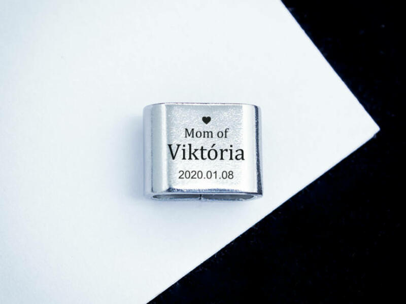 A Te varázslatod! A medálra gyermeked keresztnevét, és születési dátumukat gravírozzuk! A gyermek neve, és dátuma mellett "Mom of" felirat is helyt kap a medálon. (Lézer gravírozott szögletes alakú nemesacél csúszó medál - 12×10 mm méretű) A medál egy nyakláncra felhúzva is hordható, de alapvetően a MoMents karkötő kollekció kiegészítőjeként elérhető. A kollekci