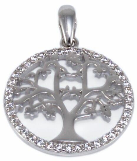 Modern stílusú, kedvelt fazonú, ródiummal bevont, cirkónia kővel ékített, áttört kialakítású fehérarany medál.