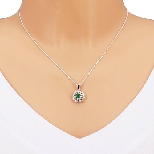 925 ezüst medál, ródiumozott felülettel virág alakban, amelynek a szirmai átlátszó cirkóniákkal van kirakva. A virág közepét egy csiszolt, zöld cirkónia alkotja. A láncra kerülő szem felfelé enyhén szélesedik és fényes. Méretek: 12 x 12 mmLáncra kerülő szem szélessége: 4 mmSúly: 1,8 gFémjelzéssel ellátott. Medál lánc nélkül. A ródiummal kezelt felület biztos