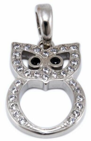 Kedves kis darab, ez cikrónia kövekkel és fekete műtermékekkel díszített, ródiummal bevont baglyot ábrázoló arany medál.