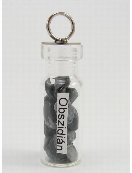 Ezoterikus üveg medál, valódi ásványkövekkel. Használható medálnak, vagy talizmánnak. 3x1cm-es üvegben, hópehely obszidián ásványok 7mm-es karika bújtatóval teljes magasság: 4cm VIGYÁZAT! TÖRÉKENY! A obszidián gyógyhatása