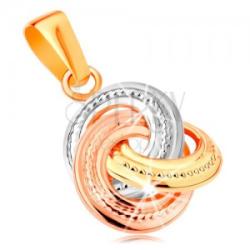 A kombinált 14K arany medál három összekapcsolt karikából tevődik össze, míg mindegyiket finom, gravírozott középő sáv díszíti. A karikák az arany három különböző árnyalatából készültek - sárga, fehér és rózsaszín. A fényes láncra kerülő szemnek hosszúkás alakja van, míg felfelé haladva enyhén szélesedik. Medál méretei: 10 x 10 mmMedál súlya: 0,5 gLán