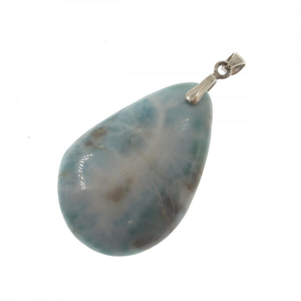 Nagyon ritka, természetes Larimar (Larimár, kék pektolit, vagy delfinkő néven is ismert) ásványból készült, csepp alakú medál. Gyönyörű ég-kék színű, felhőszerű rajzolatú drágakő ezüst medál foglalaton. Bővebb információ "ADATOK PARAMÉTEREK" fül alatt. A Larimar vélt hatása