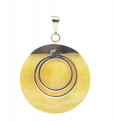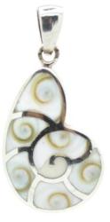 Csiszolt kagyló medál, ezüst díszítéssel925 sterling tisztaságú ezüstcsiszolt kagylóátmérő: 4 cmhossz: 5,5 cmsúly: 9,49 gramm