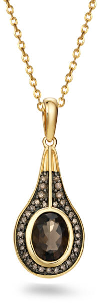 Ez a medál egy csepp alakú, finom és elegáns ékszer. Fényes aranyból készült, amely sima tapintású. A medál közepén egy ovális kő - füstkvarcit található, melynek barna színű, finom füstfátyolra emlékeztet. Ezt a középső követ apró csillogó kövek keretezik – pezsgőgyémántok, amelyek finoman csillognak, és gazdag, de visszafogott hatást keltenek. Érintésre a