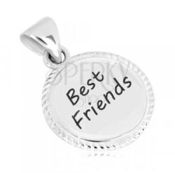 925 ezüst medál, kör alakú. A medál szélét vágatok díszítik. Az első oldalán "Best Friends" - "Legjobb barátok" felirat található amely fekete fénymázzal van kitöltve. A láncra kerülő szem hosszúkás, felfelé enyhén szélesedik. Medál mérete: 14 mmLáncra kerülő szem szélessége: 2,5 mmSúly: 2,5 gFémjelzéssel ellátott. Medál lánc nélkül.