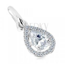 925 ezüst csepp alakú medál amely apró, kerek cirkóniákkal van körberakva. A medál közepén csepp alakú cirkónia található. A cirkóniák átlátszóak. A láncra kerülő szem ovális. Medál méretei: 8 x 13 mmLáncra kerülő szem szélessége: 2,5 mmMedál súlya: 0,7 gFémjelzéssel ellátott. Medál lánc nélkül.