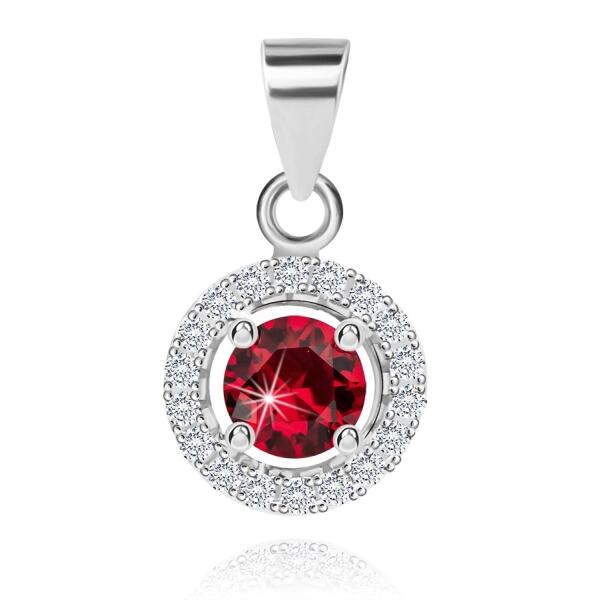 Ródiumozott 925 ezüst medál kicsi, csiszolt piros cirkónia alakban foglalatba helyezve négy karommal. A cirkónia két kontúrral van keretezve, amelyet apró, átlátszó kövek díszítenek. A láncra kerülő szem fényes és felfelé szélesedik. A medál átmérője: 10 mmA medál súlya: 1,49 gA láncra kerülő szem szélessége : 3 mm Fémjelzéssel ellátott. Medál lánc nélkül. A