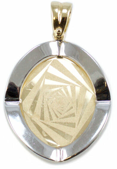 Modern stílusú, geometrikus mattírozott mintával díszített, ovális formájú, bicolor arany női medál.