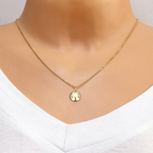 A 14K sárga aranyból készült medál az életfa tükörsimáral csiszolt körvonallal, amelyet a fa ágaival rögzítenek a sima vékony körhöz. A medál mindkét oldalán kissé kidomborodó. A lánc kapcsa ovális. Medál átmérője: 11 mmMedál tömege: 0,4 gA kapocs szélessége: 2 mmFémjel - van . A lánc nem tartozék!