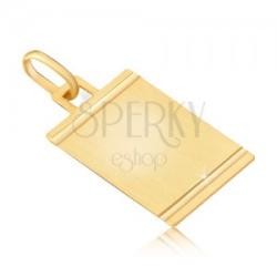 Medál aranyból matt lapos tábla alakban. A felszíne vízszintes bevágásokkal díszített a felső és alsó részen is, miközben ezek a helyek fényesek. Méretek: 12 x 21 mmA medál súlya: 0,8 gA láncon lévő szem szélessége: 3 mmMedál lánc nélkül. Fémjelzéssel ellátott.
