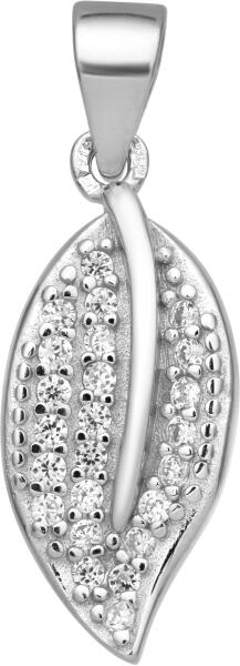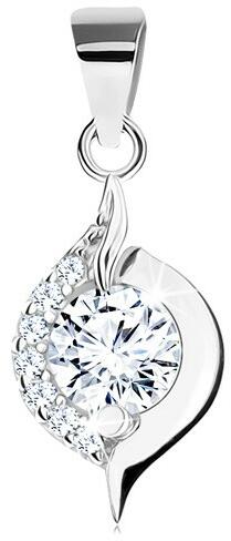 925 ezüst medál, amely aszimmetrikus csepp kontúrra hasonlít, két részre oszlik - az egyik ív átlátszó cirkóniákkal van kirakva, a másik pedig lekerekített, fényes sima felülettel rendelkezik. A medál közepére tiszta árnyalatú és kerek cirkónia van. A medál kapcsa egy nagyobb láncszemhez csatlakozik. Medál méretei: 9 x 17 mm Medál csat szélessége: 3 mm Medál súlya: