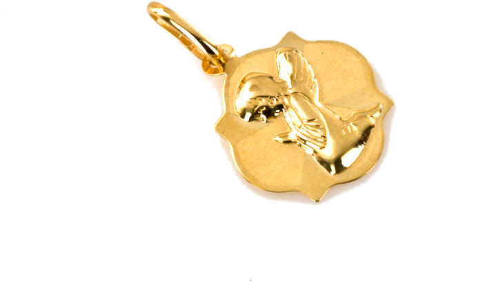 A gyönyörű angyalos medalion sárga aranyból készült. A medaliont egy imádkozó angyal képe díszíti, magasfényű bevonattal, puha szőnyeggel kombinálva.