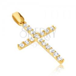 Vékony vonalból álló arany medál. Rövid nyúlványok állnak ki belőle, melyek a csillogó átlátszó cirkóniákat tartják négy oldalról. A láncra kerülő szem szélesebb és sima. Méretek: 14 x 20 mmA medál súlya: 1,0 gA láncon lévő szem szélessége: 2 mmMedál lánc nélkül. Fémjelzéssel ellátott.