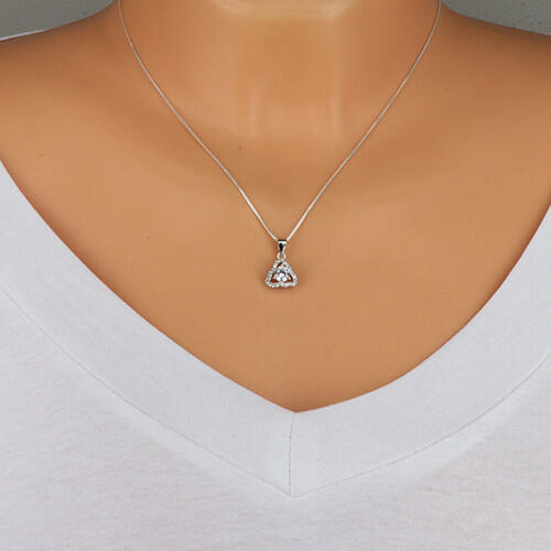A ródiummal kezelt ezüst medál egy aszimmetrikus háromszög körvonalából áll, amelyet három egymással összekötött levél alkot. A leveleket fényes, apró cirkóniák díszítik. A medál közepébe egy kerek átlátszó cirkónia van helyezve. A láncra kerülő szem fényes és sima, felfelé szélesedik. A medál mérete: 11 x 14 mmA láncra kerülő szem szélessége: 3 mmA medál