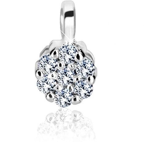 A 375 fehér arany medál kör alakú. Elülső részén csiszolt, átlátszó, kerek cirkóniák csillognak virág formájában. A láncra kerülő szem kerek alakú és a medál felső részén található. Medál méretei: 4 x 6 mmMedál súlya: 0,19 gA láncra kerülő szem szélessége: 1 mmFémjelzéssel ellátott. A medál lánc nélküli.