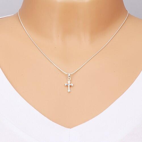 925 ezüst medál, kicsi fényes kereszt alakban, amely szárai Fleur de Lis motívummal - liliom virág végződnek. A medál kétoldalas. A láncra kerülő szem kerek alakú és spirálosan tekert. A medál méretei: 9 x 21 mmA medál súlya: 0,76 gA láncra kerülő szem szélessége: 3,5 mmFémjelzéssel ellátott. Medál lánc nélkül.