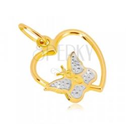 14K kombinált arany medál szív körvonal, pillangó díszítéssel. A szív vékony sárga arany, sima és fényes felületű. Oldalán egy pillangó helyezkedik el, amelynek szárnyai fehér arannyal vannak bevonva, apró golyók díszítik. A láncra kerülő szem ovális alakú. Medál mérete: 13 x 13 mmPillangó mérete: 9 x 6 mmLáncra kerülő szem szélessége: 2 mmSúly: 0,4 gFémjelz