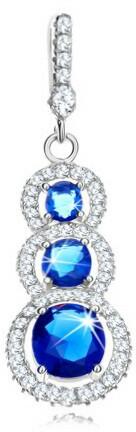 925 ezüst medál három eltérő nagyságú, egymást átfedő kerek szemből áll, melyek áttetsző cirkónia szegéllyel díszítettek. Az egyes szemek közepén négykarmos foglalatba süllyesztett kerek sötétkék cirkónia található. Az akasztó elöl áttetsző cirkónia sávval díszített. Medál mérete (akasztóval): 13 x 40 mmMedál súlya: 3,1 gAz akasztó szélessége: 2 mmFémje