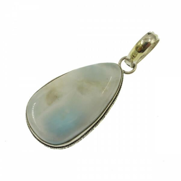 Nagyon ritka, természetes Larimar (Larimár, kék pektolit, vagy delfinkő néven is ismert) ásványból készült, fémbe foglalt medál. Gyönyörű ég-kék színű, felhőszerű rajzolatú, (mely az ásvány valódiságára jellemző) cabochon . Bővebb információ "ADATOK PARAMÉTEREK" fül alatt. A Larimar gyógyhatása