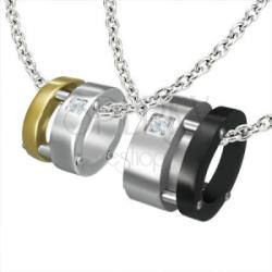 Sebészeti acélból készült medál szerelmeseknek cirkóniával. Női: arany és ezüst kombináció, szegeccsel összefogva. Férfi: fekete - ezüst kombináció nagyobb nagyságban. A medálok ezüst részében kör alakú cirkóniák vannak beágyazva egy kigravírozott négyzetben. Női medál méretei: 16 mm x 13 mmFérfi medál méretei: 18 mm x 15 mmA lánc max. szélessége: 7 mmAz ár