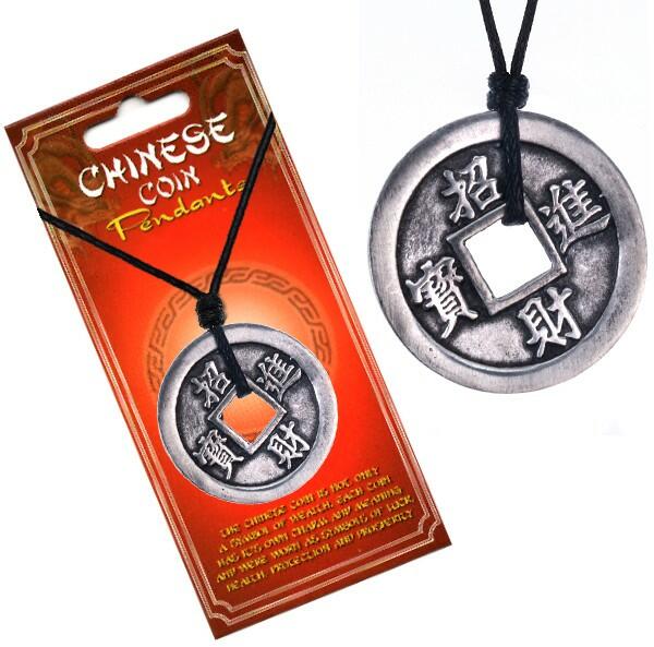 A nyakláncot egy vékony, fekete madzag alkotja, amelyet matt, ón ötvözetből készült patinás fémmedál díszít. A medálnakpénzérmealakjavan, melynek a felszínén négy kínai jel található és a másik oldalát két sárkány díszíti. A közepén egy négyzet alakú kivágás található, melyen keresztül van fűzve a madzag. Állíthatóhossz. A medál méretei: 30 x 30 mmA zsi