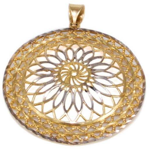 Modern stílusú, kedvelt fazonú, áttört kialakítású, ródiummal díszített, vésett, kerek arany medál.