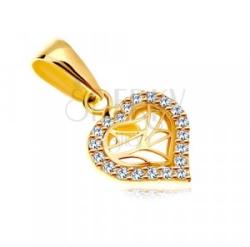 Az 585 sárga arany medál kicsi szabályos szív alakú, amelynek körvonalát átlátszó cirkóniák díszítik. A szív közepe enyhén domború, aszimmetrikus kivágásokkal. A láncra kerülő szem hosszúkás, felfelé szélesedik. Medál méretei: 9 x 9 mmMedál súlya: 0,4 gLáncra kerülő szem szélessége: 2 mmFémjelzéssel ellátott. Medál lánc nélkül.