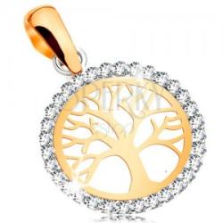 A 14K arany medált egy karika alkotja, amelynek a kerületét fehér arany és átlátszó cirkóniák díszítik. A körben egy terebélyes életfa található, amely sárga aranyból készült. A láncra kerülő szem hosszúkás és felfelé haladva enyhén szélesedik. Medál átmérője: 12 mmMedál súlya: 0,5 gLáncra kerülő szem szélessége: 2 mmFémjelzéssel ellátott. Medál lánc n