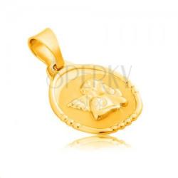 Medál 14K sárga aranyból lapos ovális alakban. A matt részt egy díszes keret fogja körbe golyókkal a kerületén. A láncra kerülő szem felfelé mérsékelten szélesedik. A medál méretei: 13 x 17 mmA medál súlya: 0,6 gA láncra kerülő szem szélességeu: 4 mmFémjelzéssel ellátott. Medál lánc nélkül.